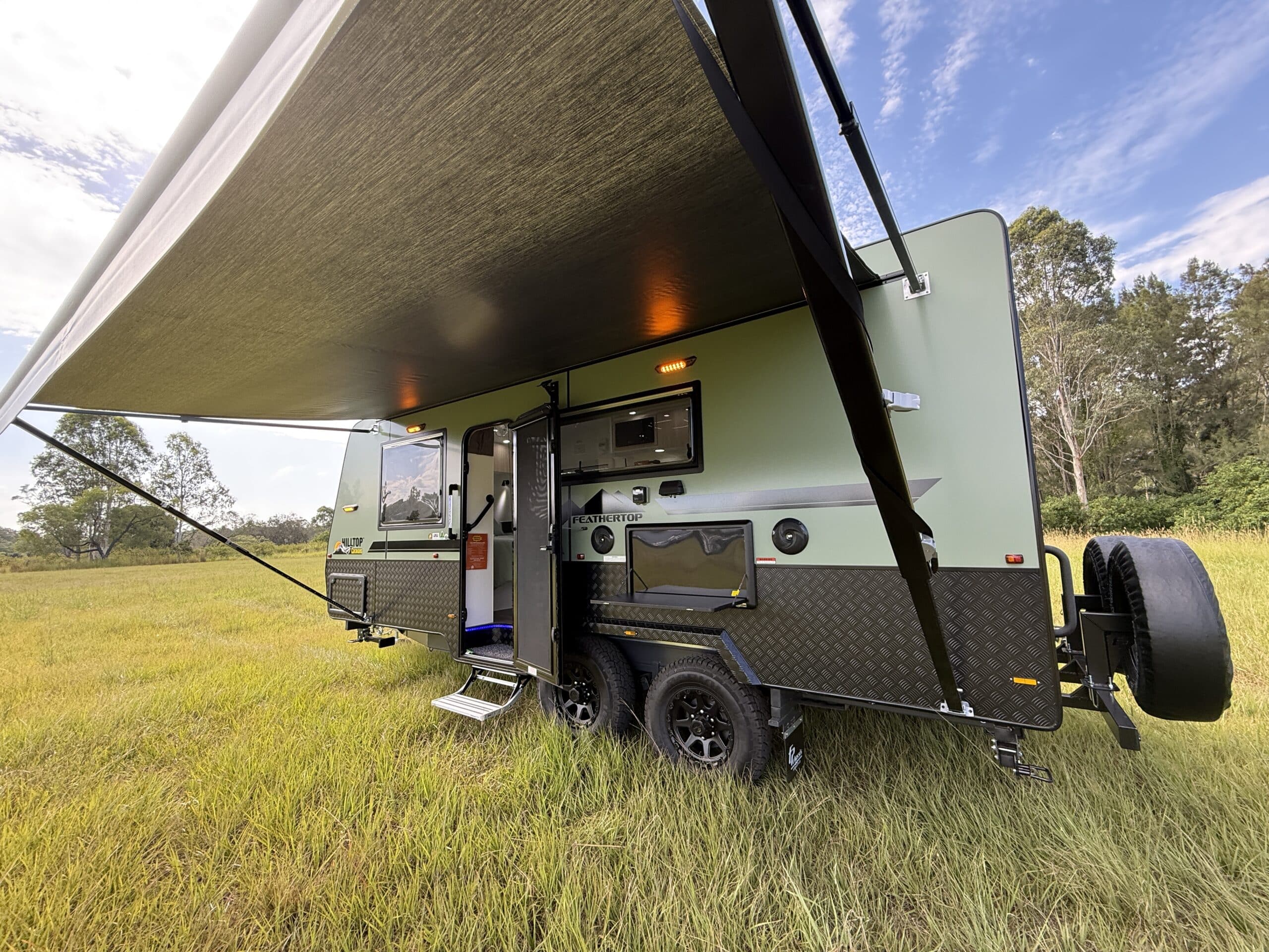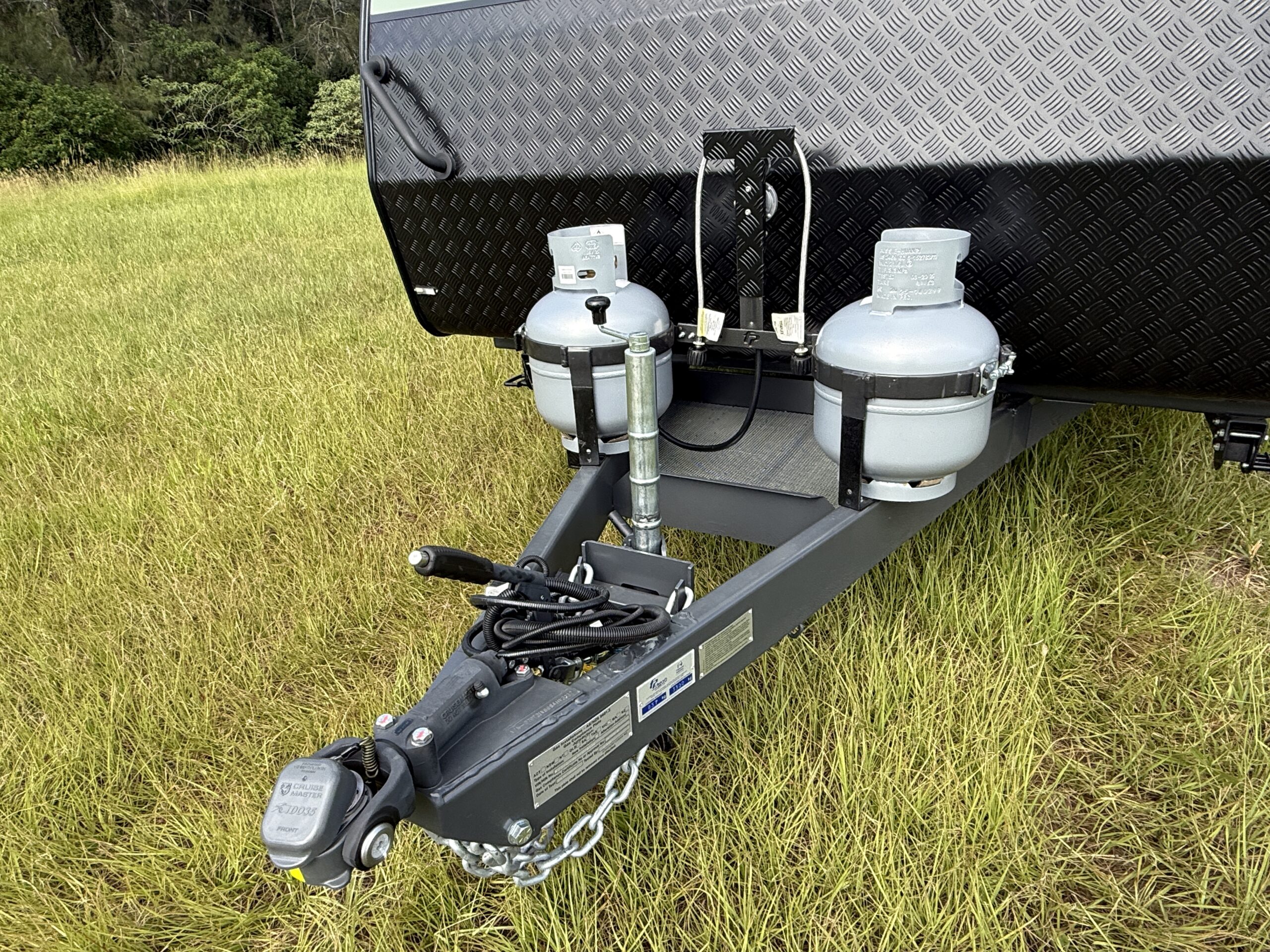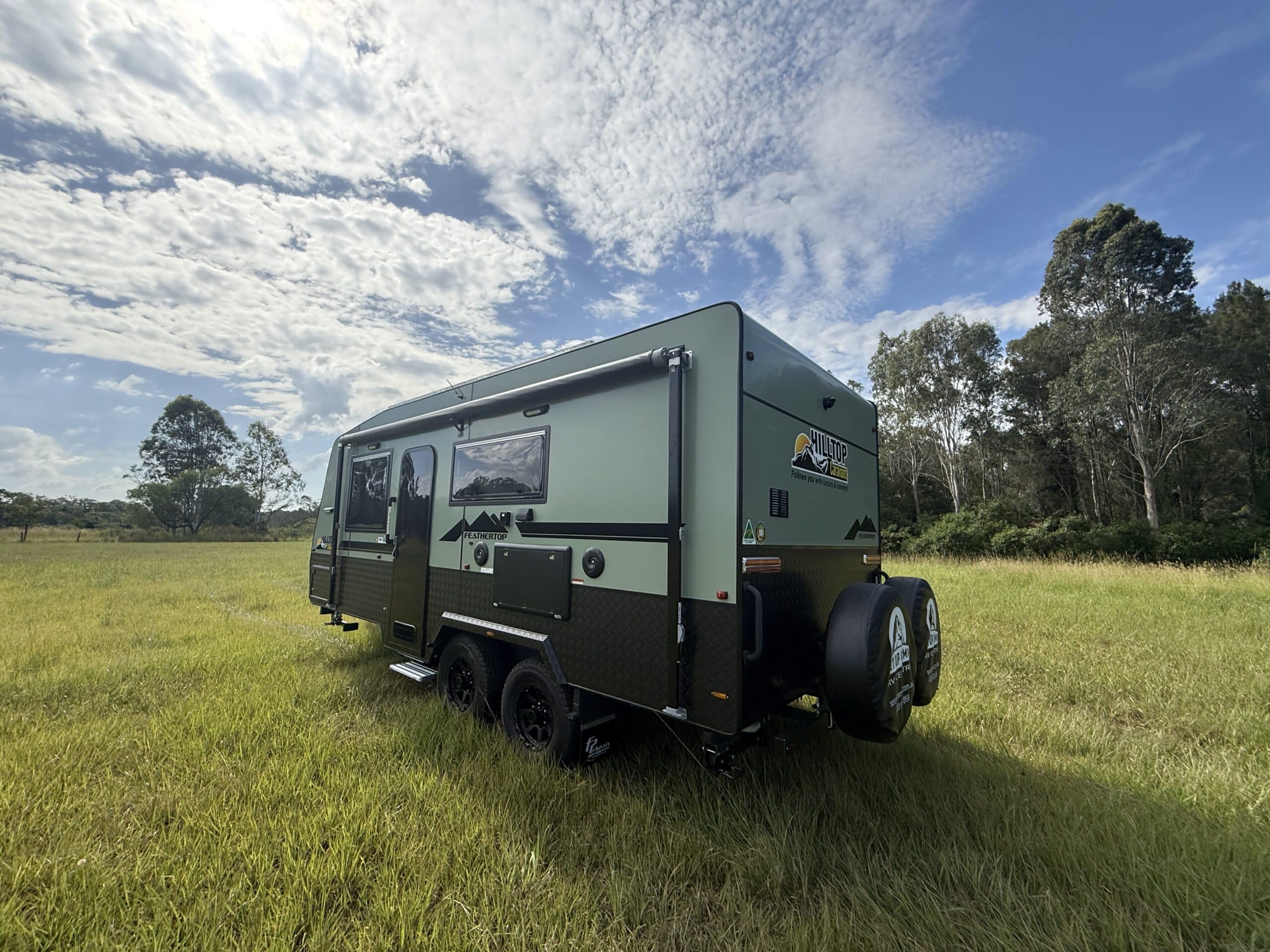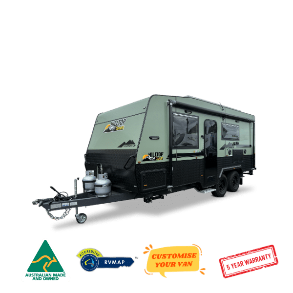 | Chassis and Suspension | 6″Australian steel chassis Alko 3.3T Leaf Spring Suspension Cruisemaster DO35 Hitch 15″ Wheels with All Terrain tyres 3 Arm bumper with 2 spare wheels and jerry can holder |