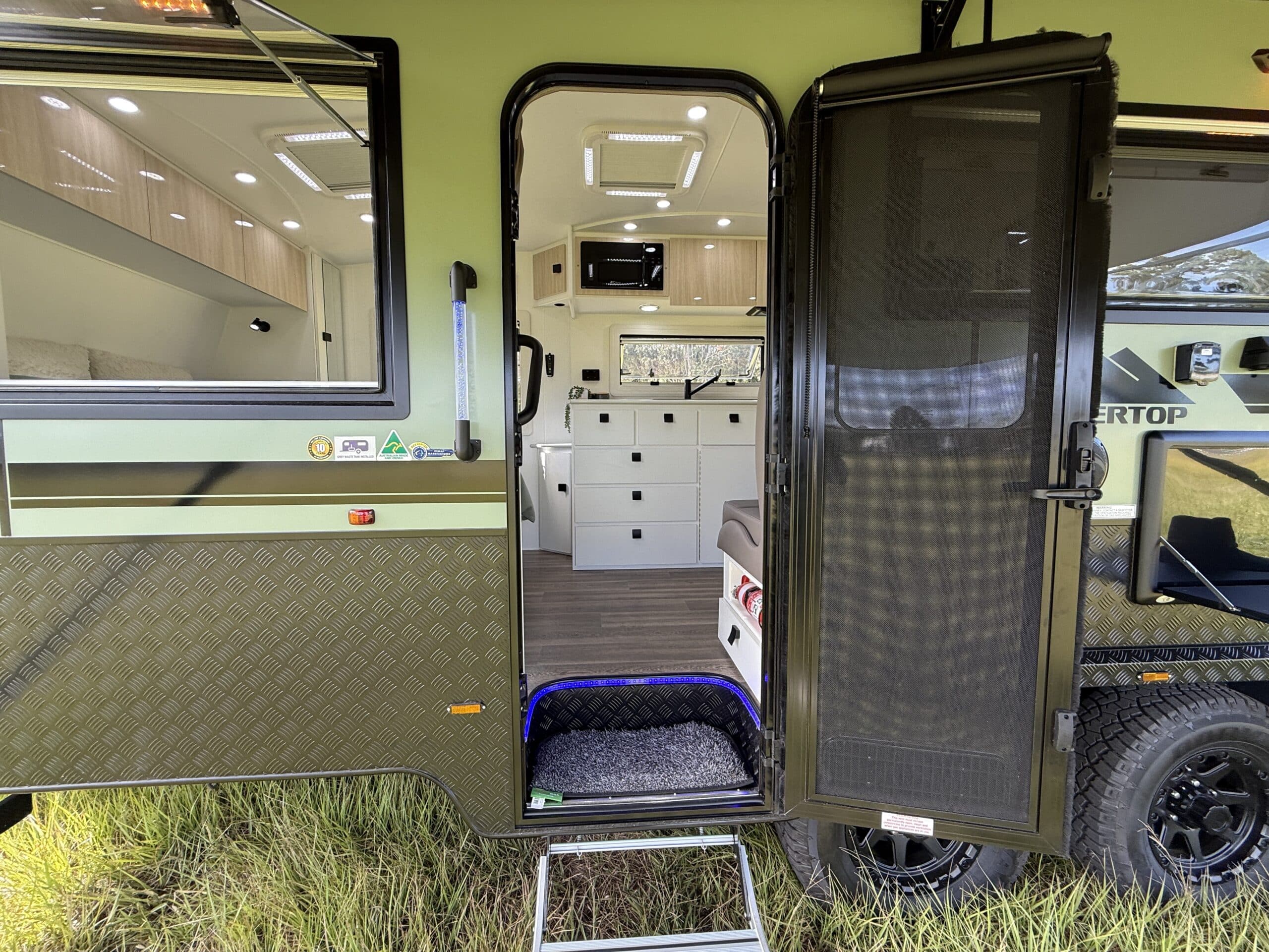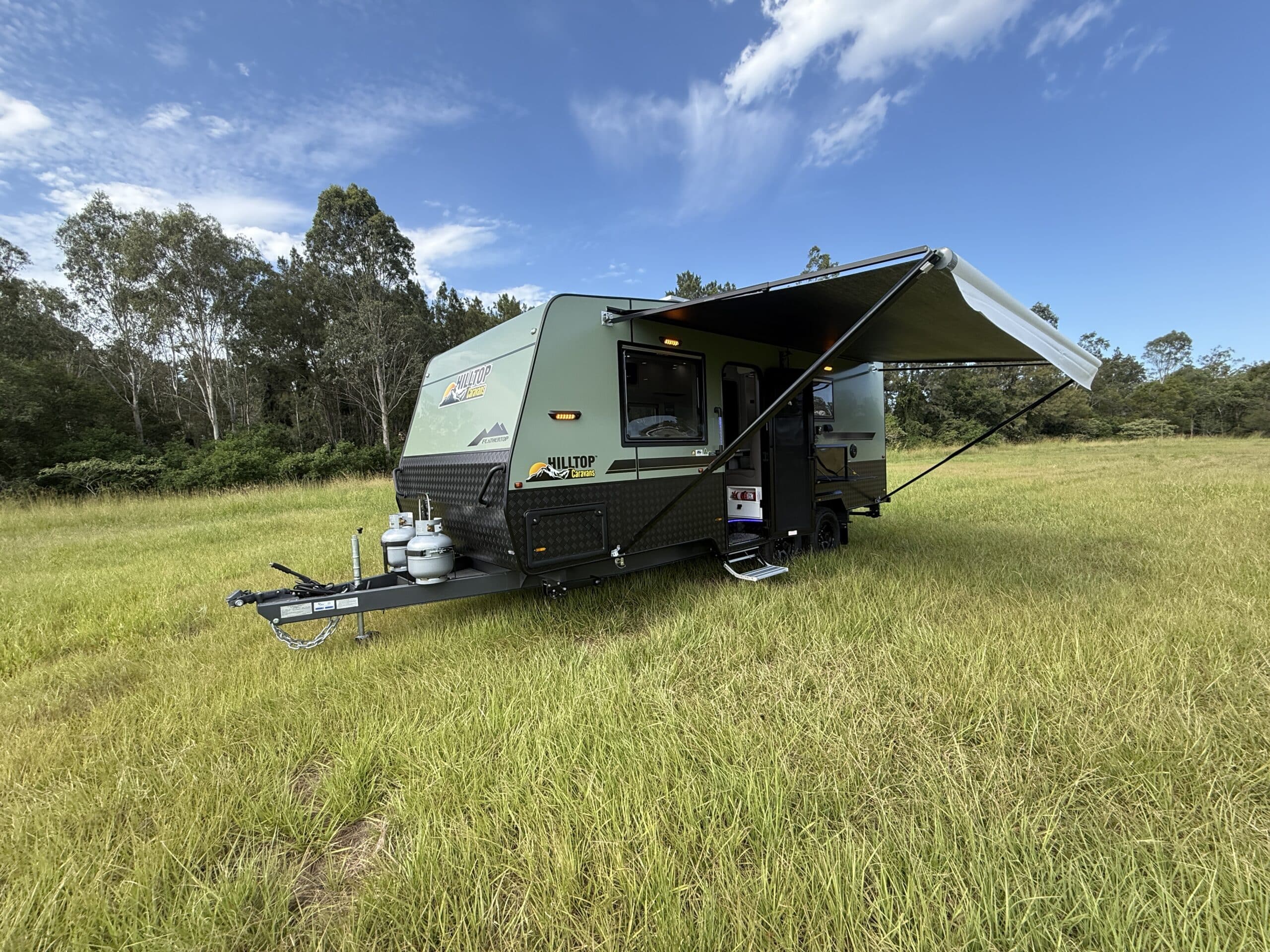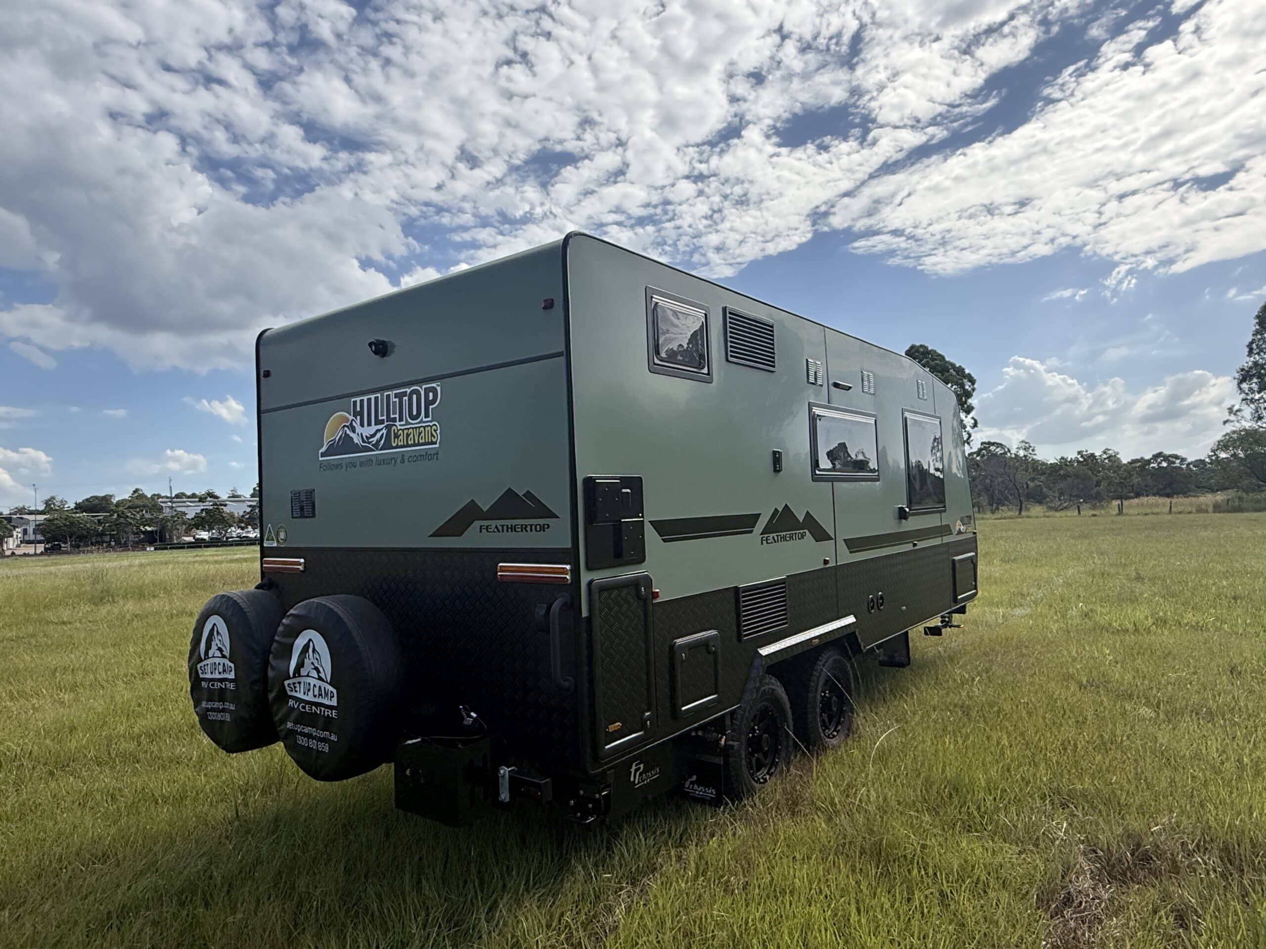 | Chassis and Suspension | 6″Australian steel chassis Alko 3.3T Leaf Spring Suspension Cruisemaster DO35 Hitch 15″ Wheels with All Terrain tyres 3 Arm bumper with 2 spare wheels and jerry can holder |