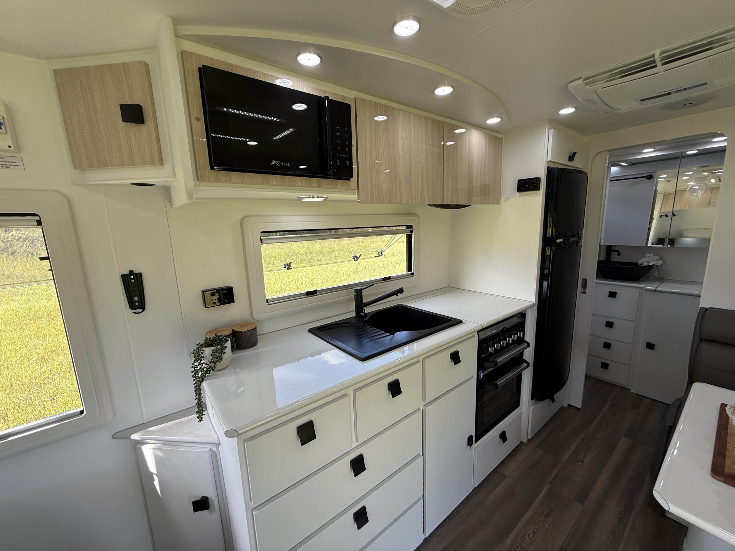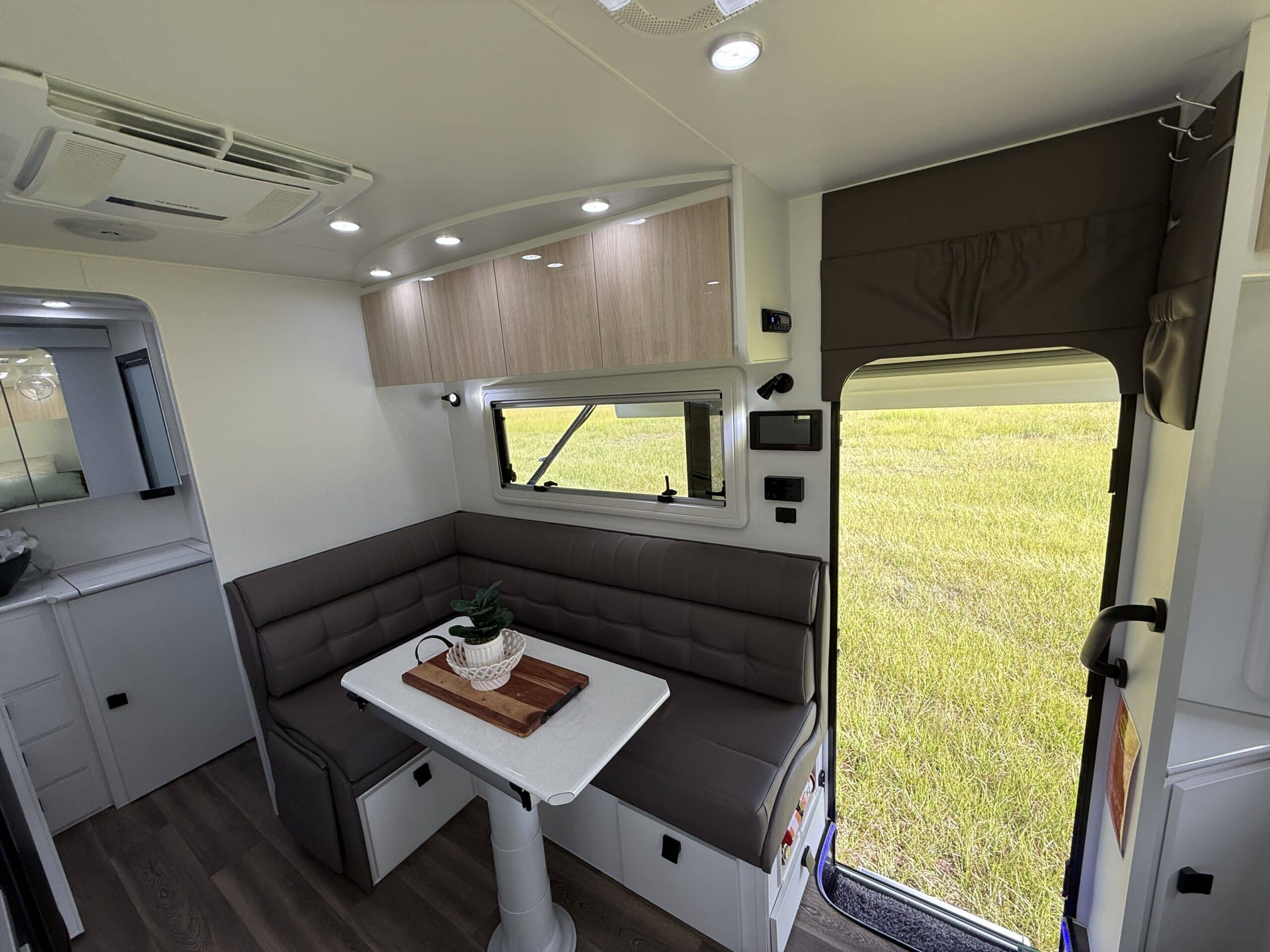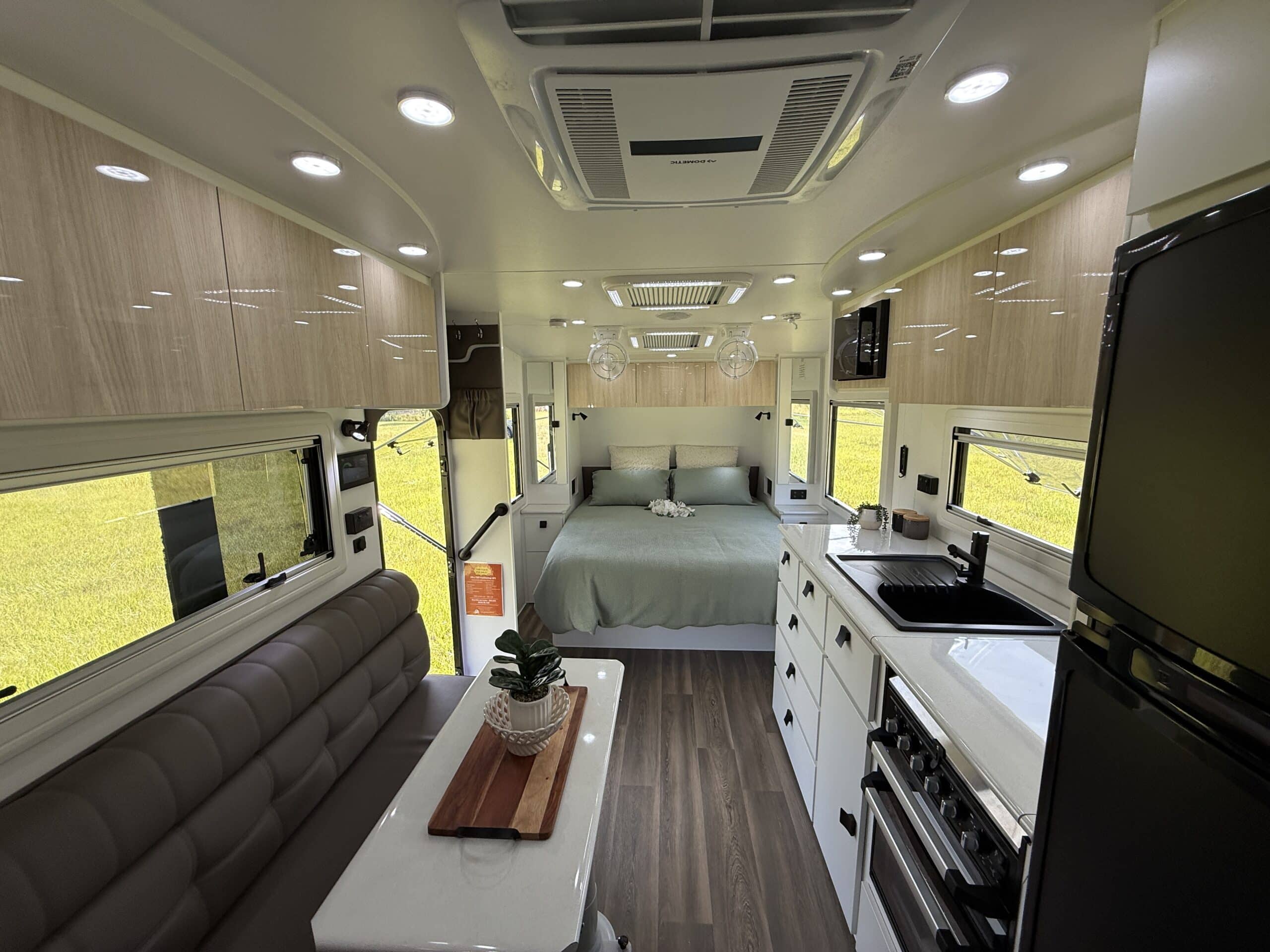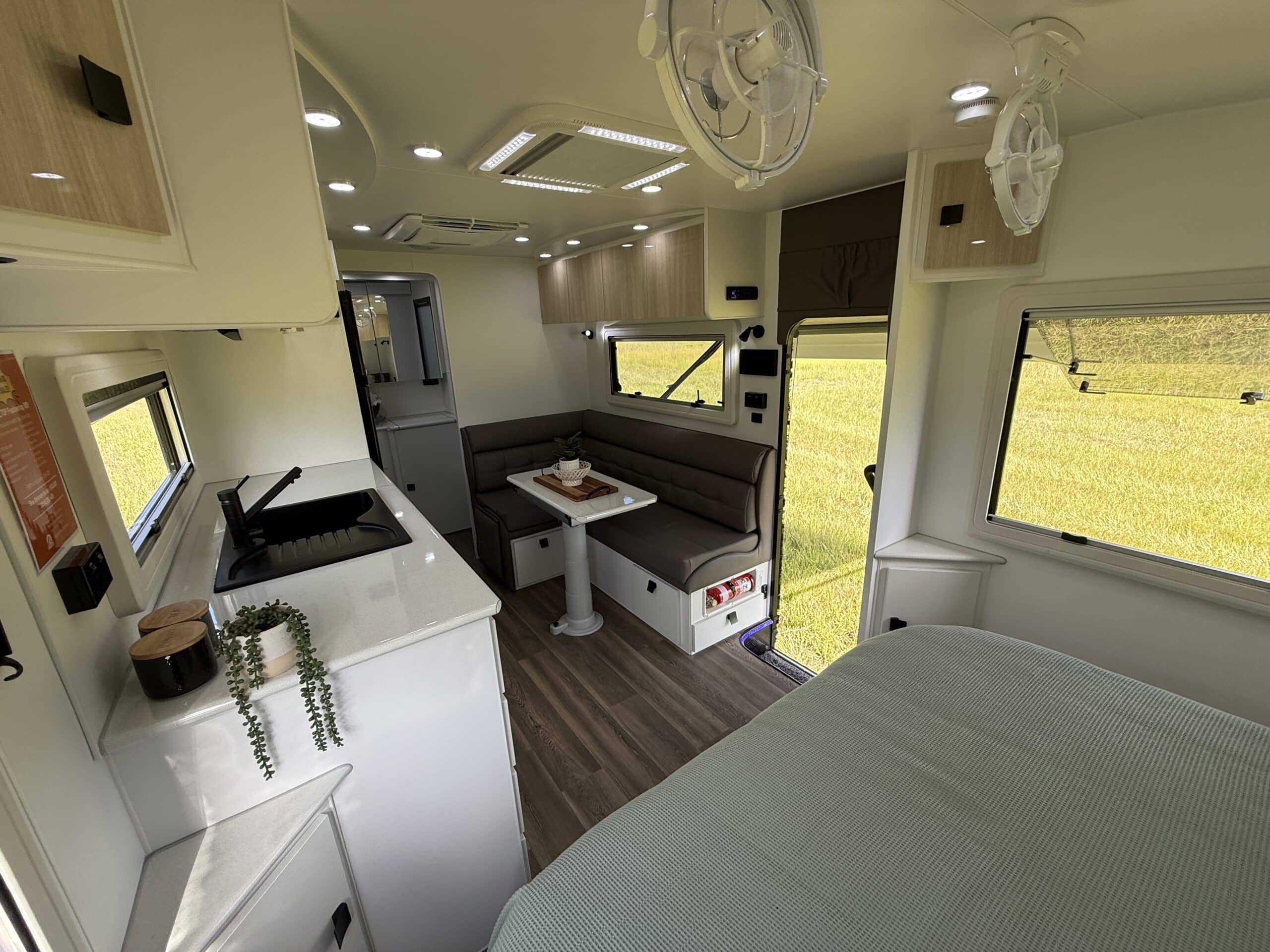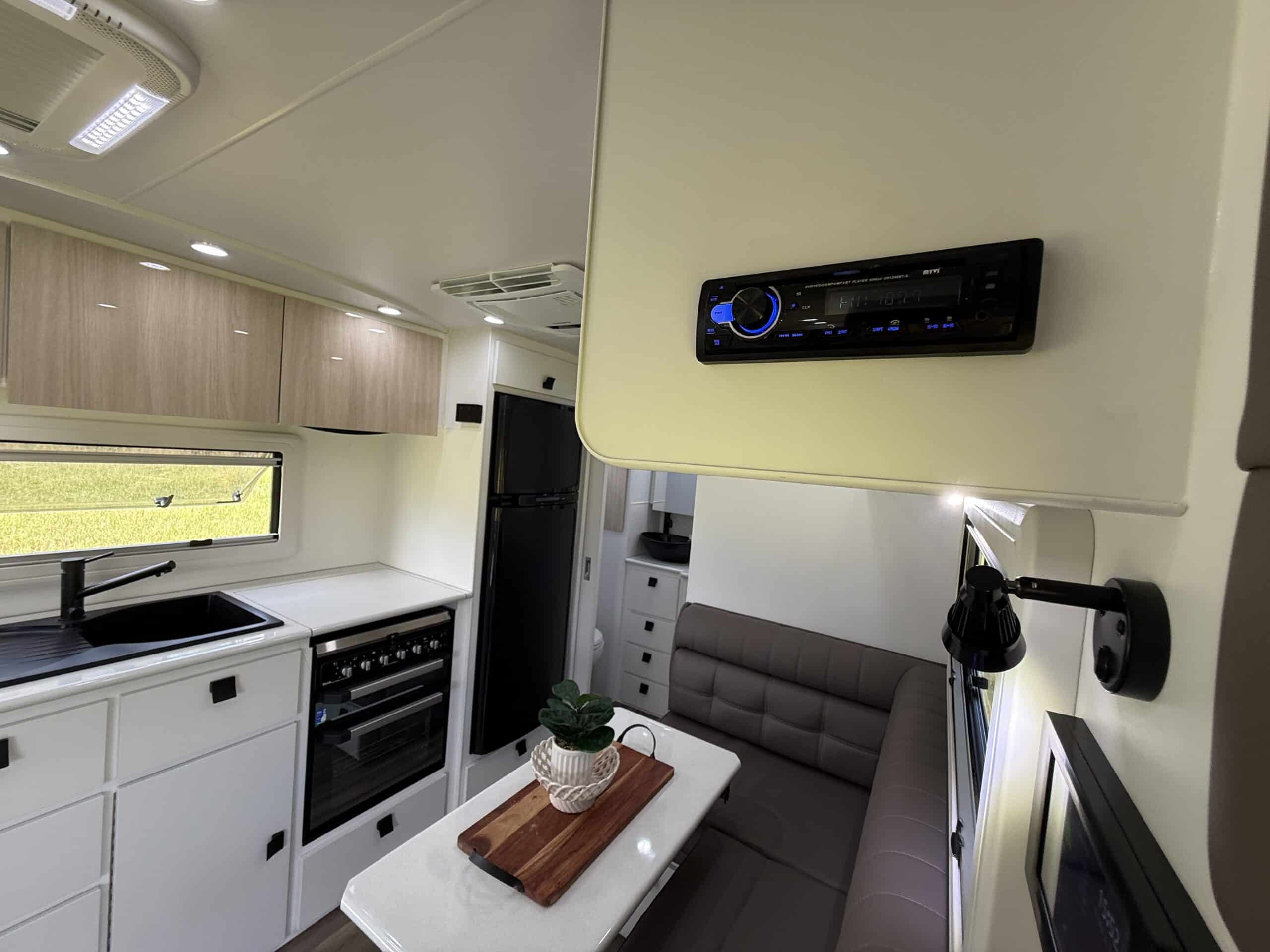 | Internal Features | Full kitchen including Swift fan forced oven and 4 burner cooktop 199L 3 Way fridge / freezer ‘L’ shape lounge with hydraulic table or cafe seating Hawk microwave Queen size island bed with pillow top mattress Storage under bed Dual hanging robes plus overhead cabinets over bed 24inch TV with DVD head unit Bluetooth stereo system with internal and external speakers Full width rear bathroom with Thetford china bowl toilet Linen and medicine cabinet 3.5Kg top loader washing machine One piece moulded shower Overhead cabinets 2 x roof hatches with fans and LED lighting Ranger windows Dometic FreshJet 7 Series Pro A/C 2 x Sirocco fans Feature bulk heads with LED down lights for each overhead cupboard LED Strip lighting internal and on entry step |