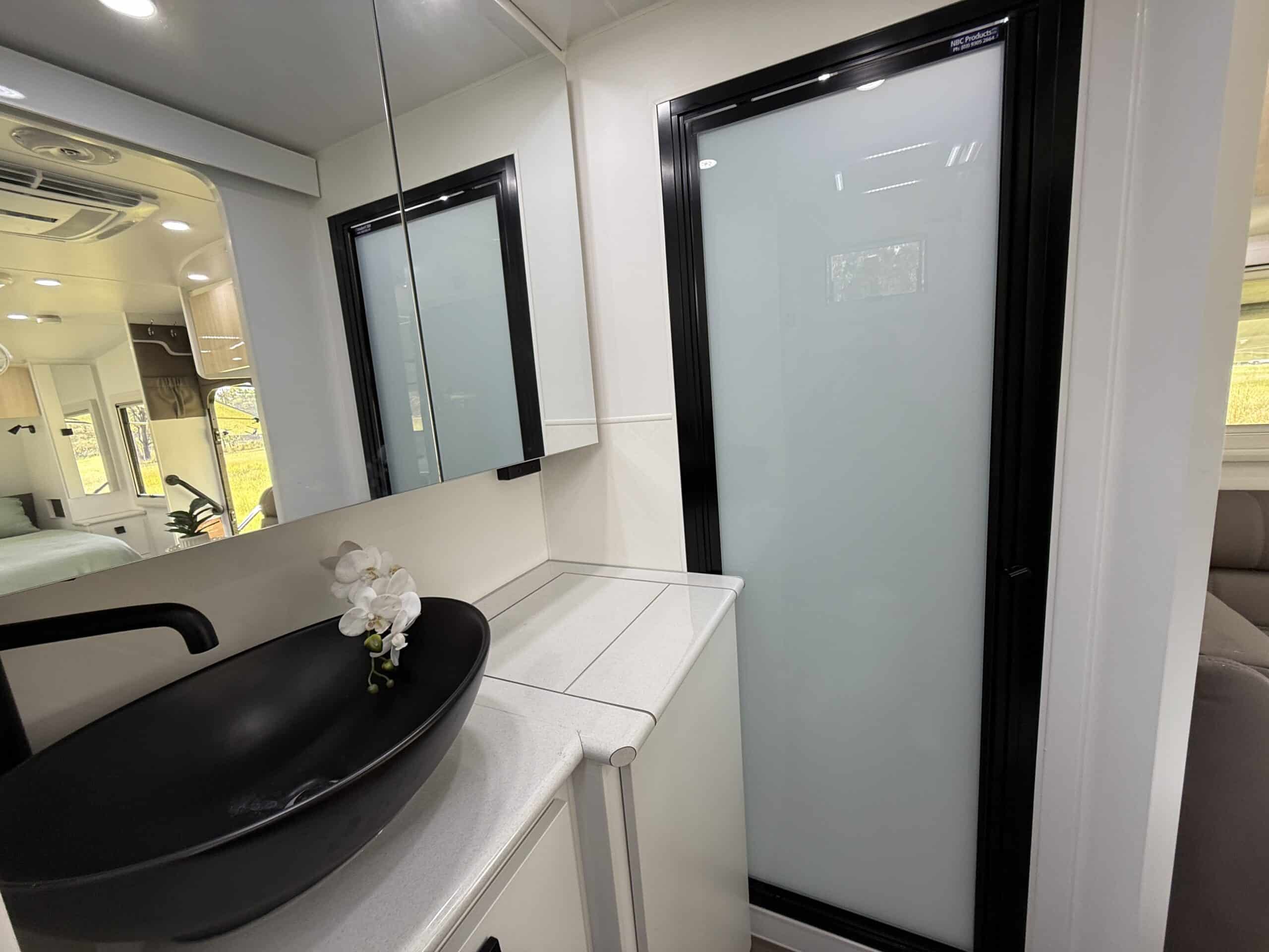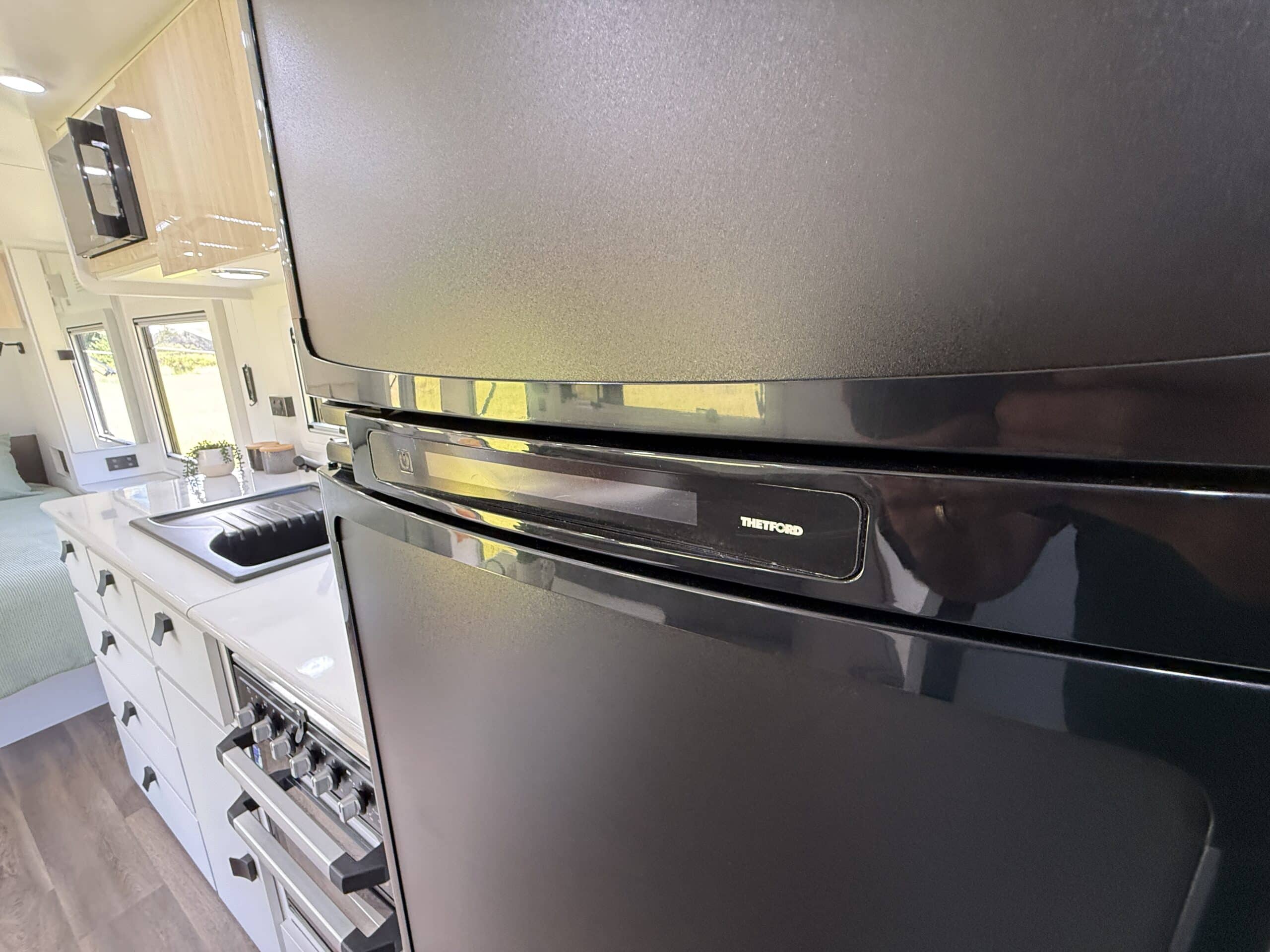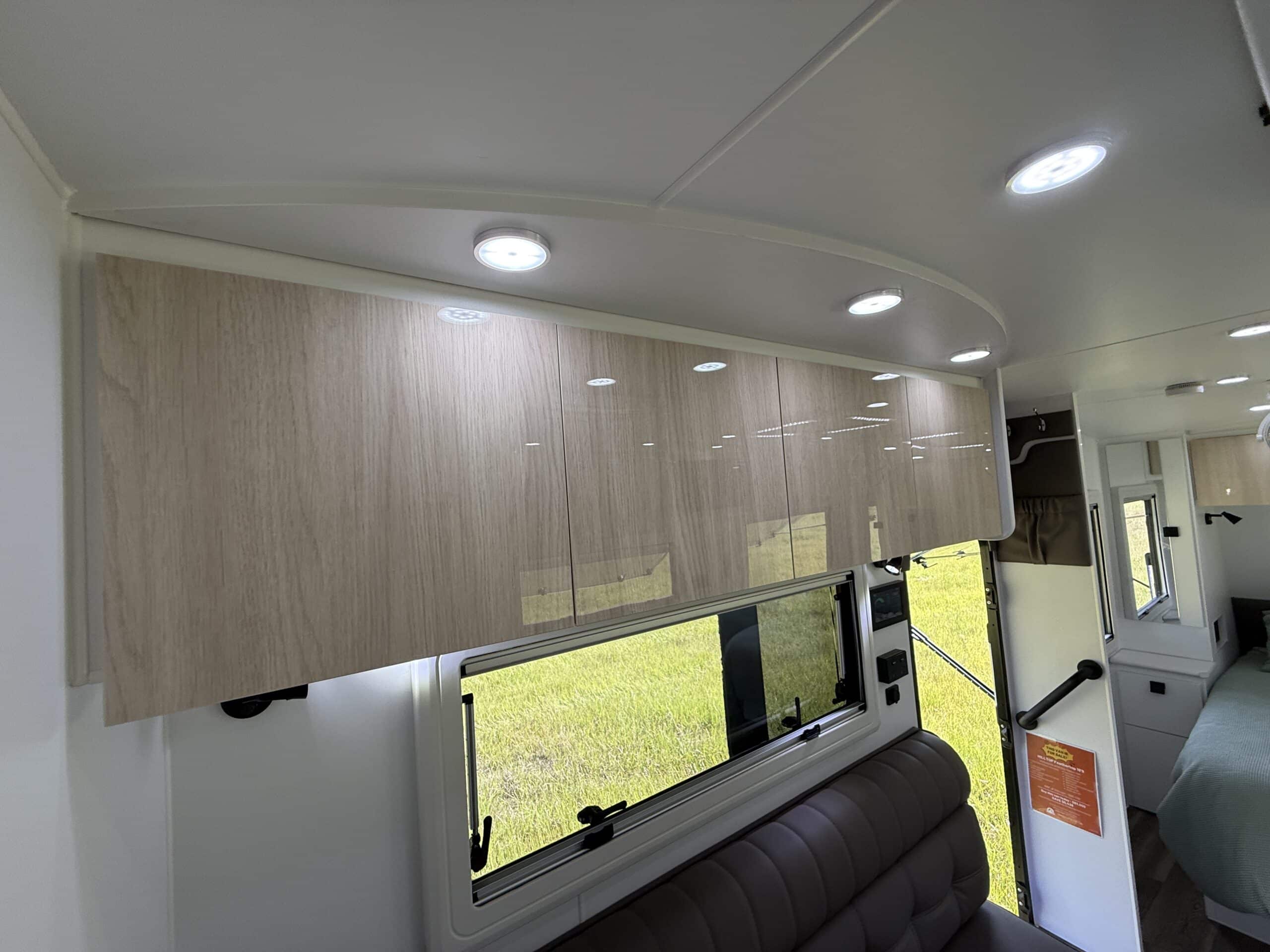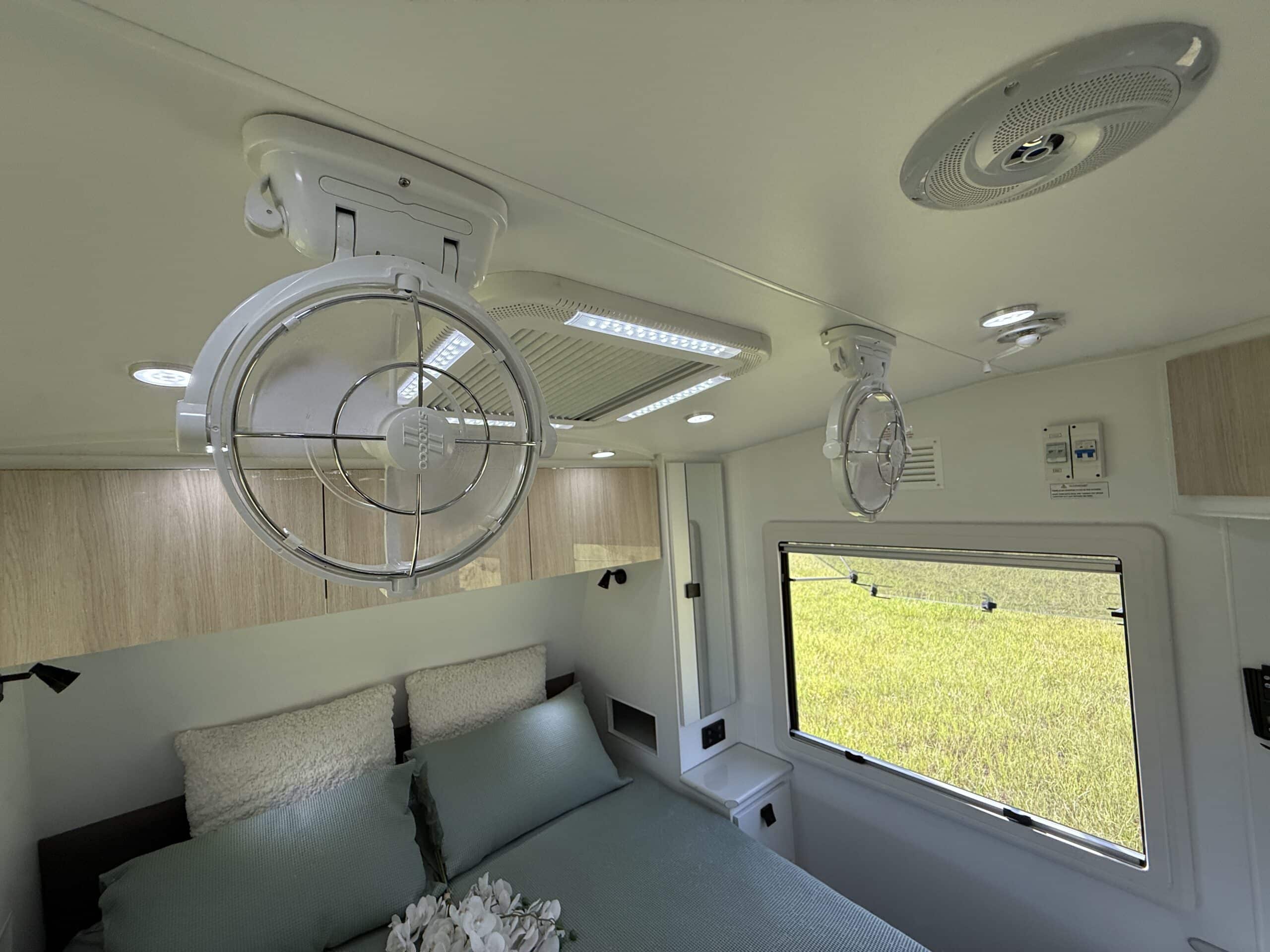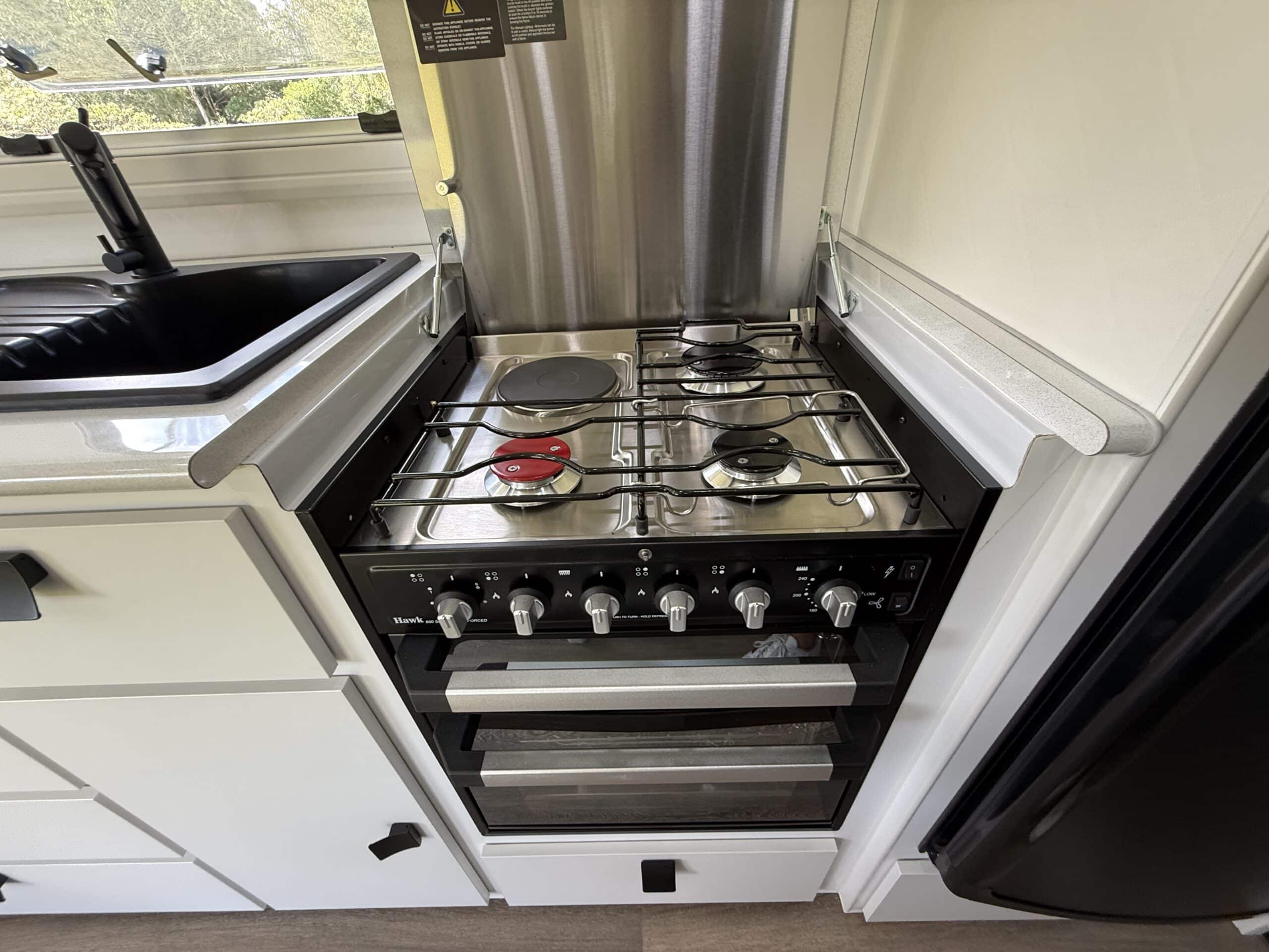 | Internal Features | Full kitchen including Swift fan forced oven and 4 burner cooktop 199L 3 Way fridge / freezer ‘L’ shape lounge with hydraulic table or cafe seating Hawk microwave Queen size island bed with pillow top mattress Storage under bed Dual hanging robes plus overhead cabinets over bed 24inch TV with DVD head unit Bluetooth stereo system with internal and external speakers Full width rear bathroom with Thetford china bowl toilet Linen and medicine cabinet 3.5Kg top loader washing machine One piece moulded shower Overhead cabinets 2 x roof hatches with fans and LED lighting Ranger windows Dometic FreshJet 7 Series Pro A/C 2 x Sirocco fans Feature bulk heads with LED down lights for each overhead cupboard LED Strip lighting internal and on entry step |