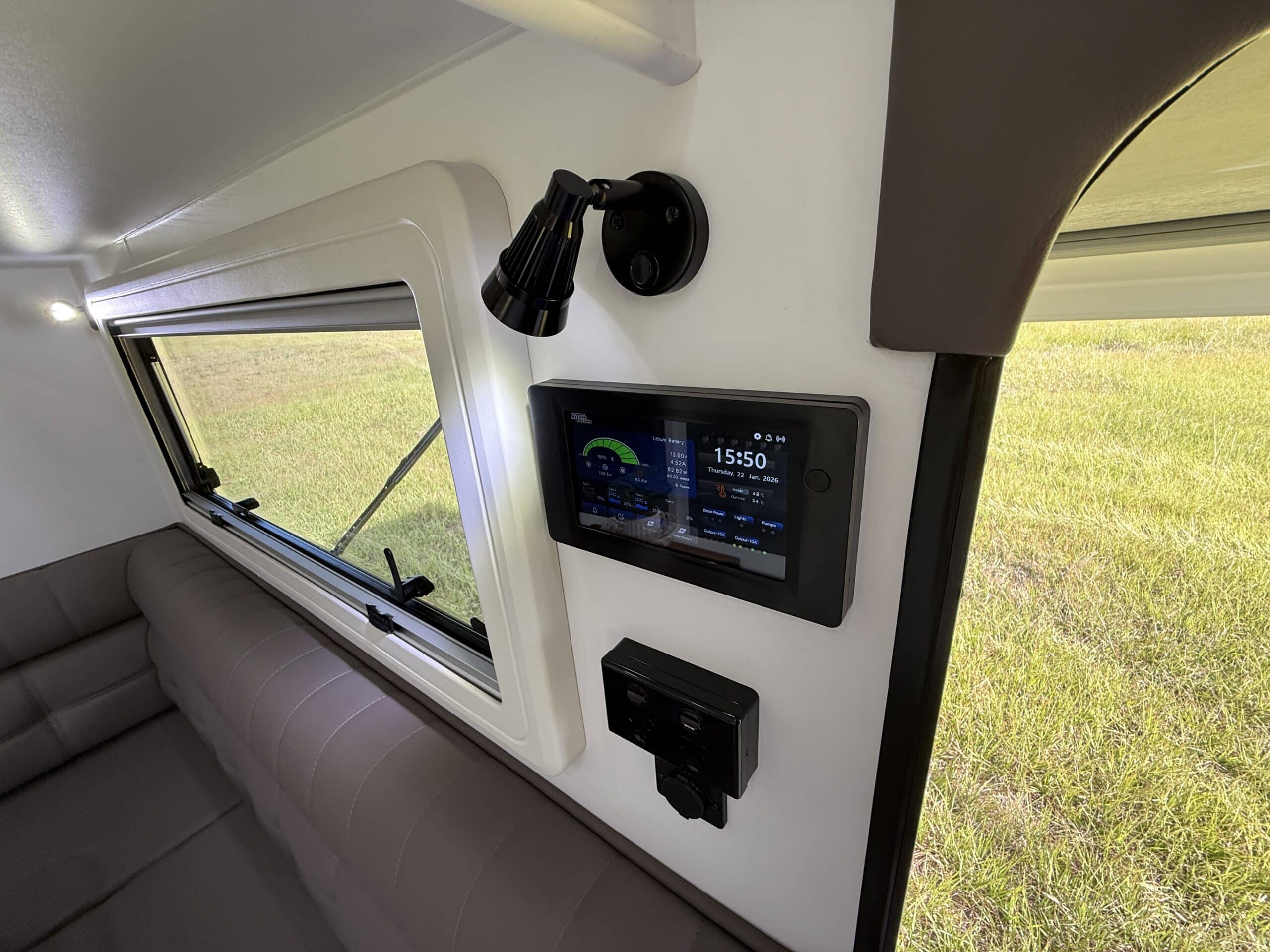 | Electrical | Hi-Tech battery management with touch screen 600W of solar (3 x 200W solar panels) 1 x 314Amp Lithium battery 2600W inverter wired to all points 3 in One Charger – Includes DCDC Charger, MPPT Controller and ACDC Charger |