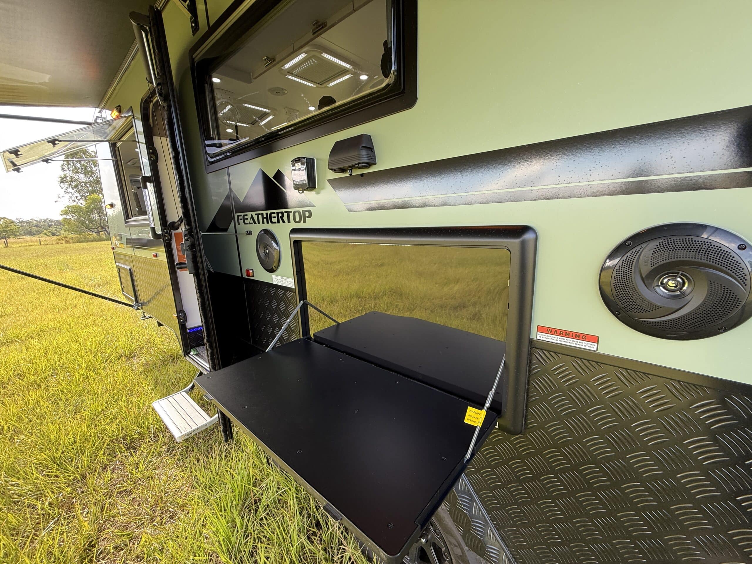 | External Features | Meranti Frame Construction Single piece roof Composite finish with your choice of colours Dometic manual roll out awning Extended checker plate on side and front of van Amber / White Annex lights 2 spare wheels Galvanised tunnel boot with internal lighting Rear generator hatch Safety Dave reversing camera with monitor for your vehicle Gas Bayonet connection |